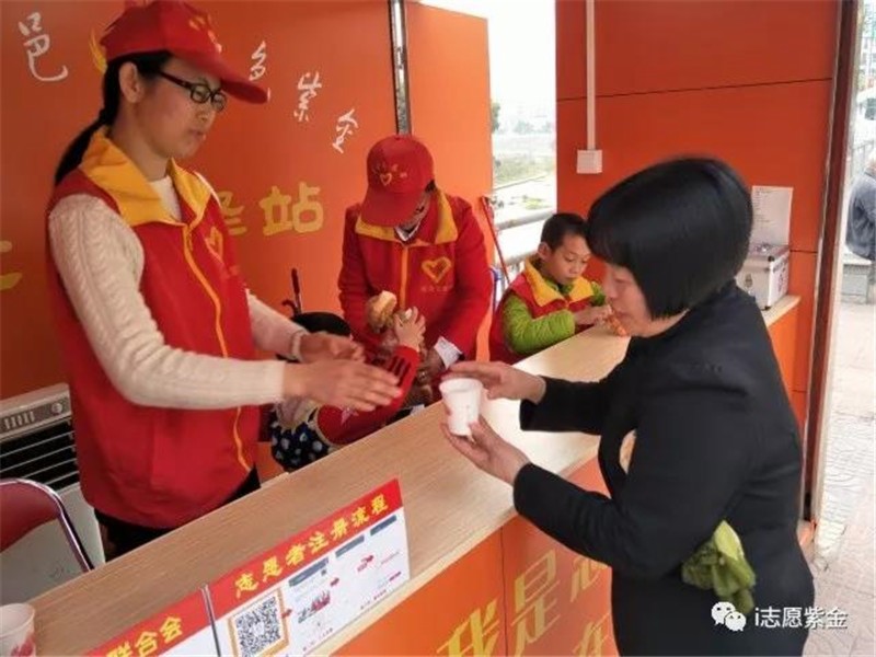 志愿者为老人送上一杯热水,让老人们在这个冬天不太冷。