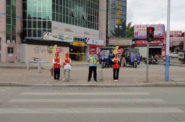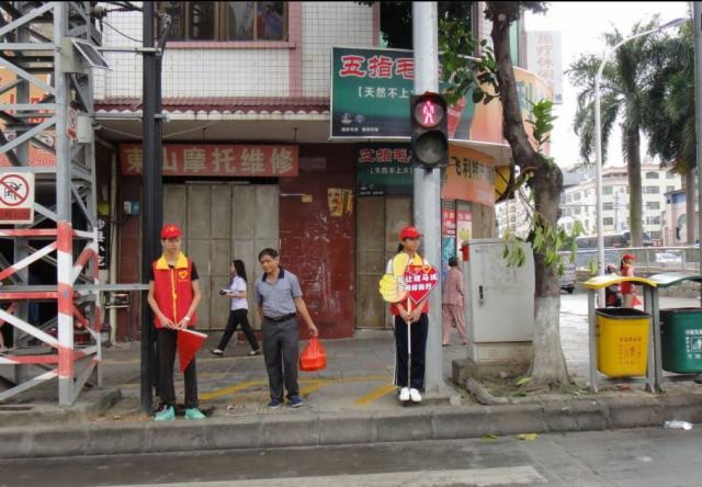 大学生志愿者在红绿灯下、斑马线旁,与警察叔叔一起挥旗指挥、文明劝导
