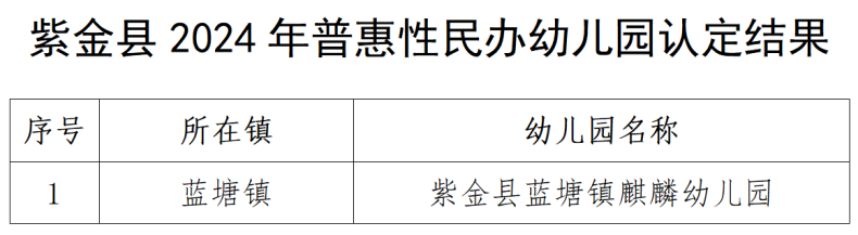 为进一步扩大我县普惠性学前教育资源供给,积极扶持民办幼儿园提供普惠性服务,根据《B体育普惠性民办幼儿园认定、扶持和管理工作细则的通知》(紫教〔2022〕279号)和《关于开展2024年普惠性民办幼儿园申报认定工作的通知》(紫教字〔2024〕208号)要求,经民办幼儿园自主申报、所在镇中心小学初审、县教育局评估小组现场审查、局党组(班子)会议研究,认定B体育蓝塘镇麒麟幼儿园为普惠性民办幼儿园。现予以公示,公示时间为12月11日至15日。